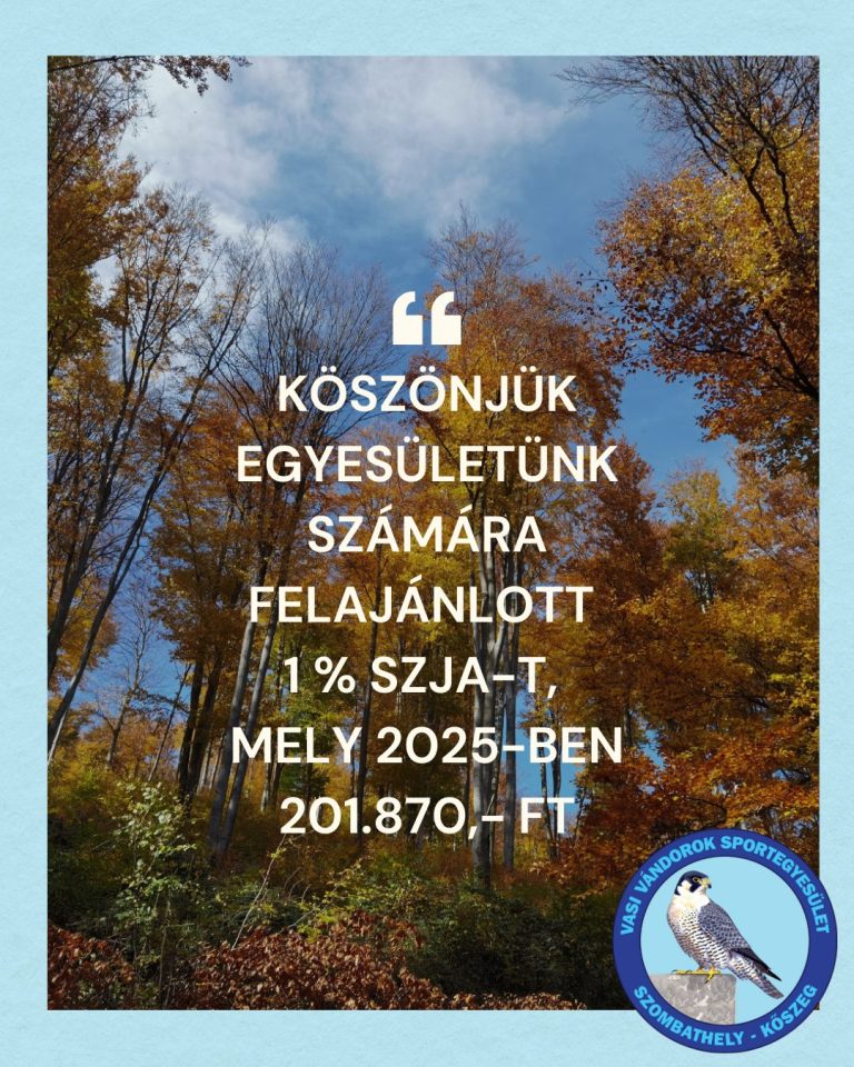 Köszönjük, a részünkre felajánlott 1%-ot, ami 2025-ben 201.870,- forintot jelentett a számunkra! Ígéretünk szerint túráink színvonalának megtartására, növelésére fordítjuk a Tőletek kapott összeget!